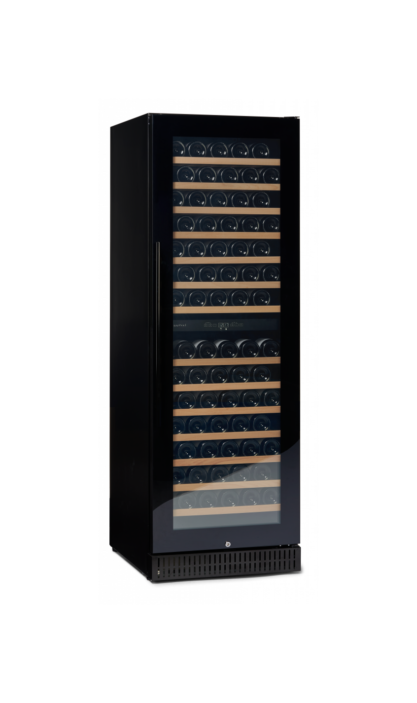 Med sin tidløse design, trehyller og sotede sikkerhetsglass, har vinskapet et eksklusivt preg. Opplev den perfekte temperaturkontrollen med to soner som gir deg muligheten til å skape ideelle forhold for både rødvin og hvitvin, og nyt en smaksopplevelse som er uten sidestykke. Vinskapet har god lagringskapasitet, her er det plass til 159 vinflasker i standard 75 cl størrelse. Skapet er frittstående slik at du enkelt kan plassere det der du vil.